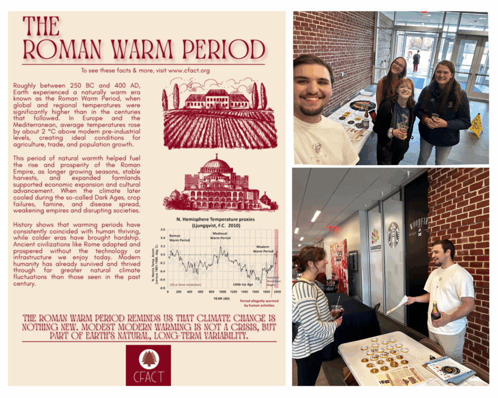 On October 30th, Liberty University student and CFACT Collegian Silas Pearson set up shop in the campus Student Union with an unconventional invitation: “Come taste the climate of the past.” His Roman Warm Period themed Mock Wine Giveaway paired flavor with history to show fellow students that climate change isn’t new—and certainly not catastrophic.