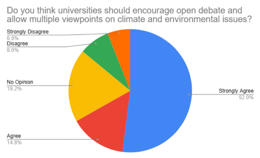 Lastly, the loudest verdict of all: students want universities to encourage open debate and multiple viewpoints on climate and environmental issues—66.8% agreed, with only 14.0% opposed.